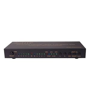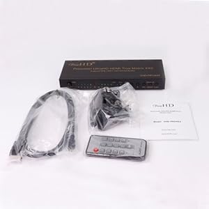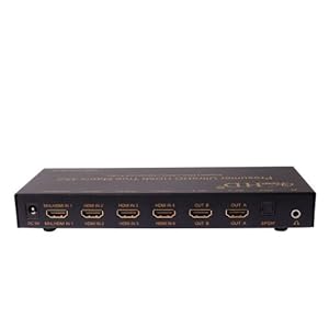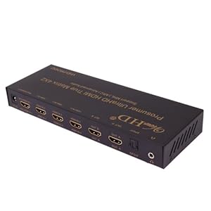 This is the newest Prosumer Series HDMI 4X2 Matrix from ViewHD to support Ultra HD, ARC and MHL Applications. This advanced Prosumer UltraHD HDMI 4x2 Matrix can connect four HD Sources to support two HD displays with video resolution up to Ultra HD / 4K (4096x2160@24fps or 3820x2160@30fps). It also provides advanced audio features to support a wide range of applications, including ARC, stereo analog audio output, TOSLINK optical audio (Dolby Digital / AC3 and DTS 5.1CH) output and more advanced audio formats (Dolby Digital Plus, Dolby TrueHD, DTS-HD Master Audio, PCM 5.1 / 7.1 and beyond) through HDMI output. ARC audio signal is available from SPDIF output ONLY, when a ARC enabled TV is connected to HDMI output A with a HDMI v1.4 cable. SPDIF and 3.5mm analog audio outputs are coupled to HDMI output A. SPDIF support audio format up to Dolby Digital / AC3 5.1CH and DTS 5.1CH; the amplified 3.5mm analog audio only supports incoming audio format of 2CH / Stereo; the 3.5mm analog output does not support ARC and will NOT have sound if the incoming HDMI audio format is higher than 2CH / Stereo. Again: SPDIF optical audio output does NOT support audio formats higher than DD & DTS 5.1CH, such as Dolby Digital Plus, TrueHD, DTS-HD MA, PCM 5.1 and beyond. Comes with ViewHD One Year Warranty. + HDCP and CEC Pass Through + Support AWG26 HDMI v1.4 cable up to 15metres @ 1080P & 3D; 5metres @ Ultra HD / 4K + MHL port supports RCP function to enable control through smart phone and TV remote + Full metal jacket construction for durability and better heat dissipation Package Includes: 1. One VHD-PRO4X2 main unit 2. One 5V2A Universal 100V-240V Power Adapter with EU plug 3. One Remote Control 4. One User Manual 5. One MHL to HDMI converter cable